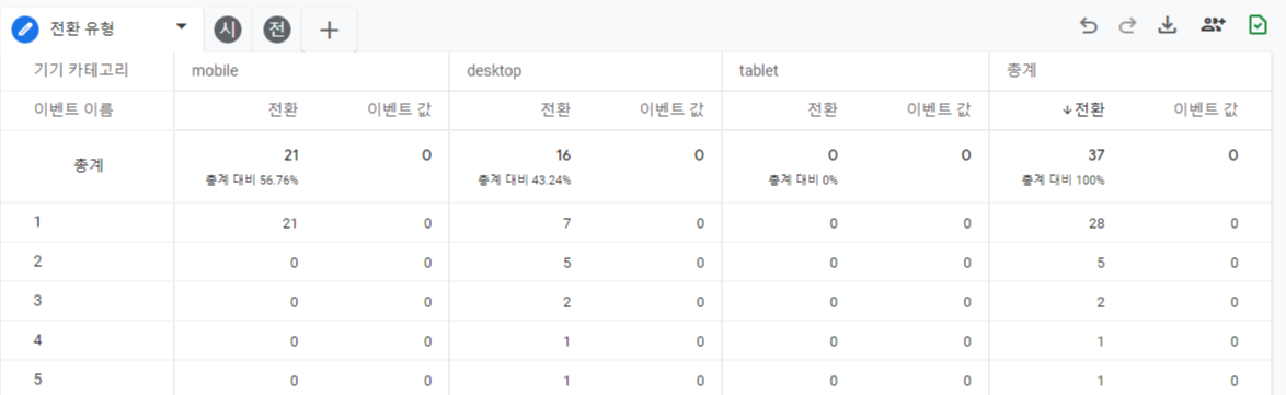 해당 경로가 그림으로 되어 있어서 직관적이지만 데이터를 한 눈에 보기는 어렵습니다. 그런 경우는 분석 허브에서 전환을 클릭해서 전환된 값을 수치로 확인할 수 있습니다.