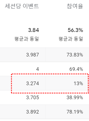 이번에는 트래픽 획득을 보겠습니다. 구글이라는 매체의 cpc라는 광고를 통해서 가장 많이 들어왔습니다. 여기서 (direct)/(none)에 대한 단서를 읽을 수 있습니다. 다른 유입 채널에 비해 참여율이 상당히 낮죠. 확대해서 보겠습니다.