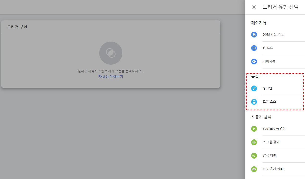 이제 '클릭 > 링크만'을 선택합니다. 해당 버튼만 해당하므로 일부 클리 클릭을 선택합니다.