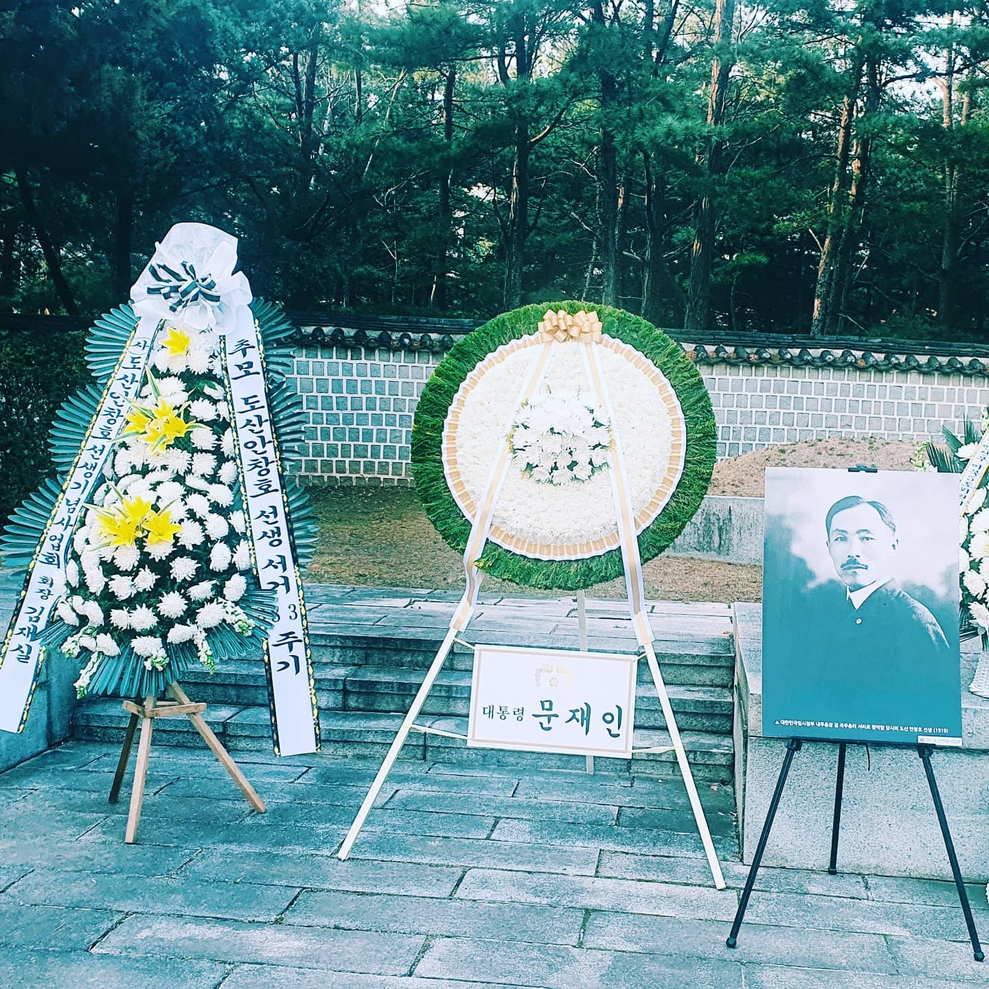 도산공원을 둘러보는 가운데 문재인 대통령의 화환이 눈에 띤다. 대통령이야 나라의 어른으로 기리는 마음 이해한다만 일반인들의 꽃은 따로 없어 아쉽다.